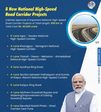 The Cabinet Committee on Economic Affairs, chaired by Prime Minister Narendra Modi, has approved the development of eight significant National High-Speed Corridor projects spanning 936 km, at a total cost of Rs. 50,655 crore. These projects are expected to generate approximately 4.42 crore mandays of direct and indirect employment.